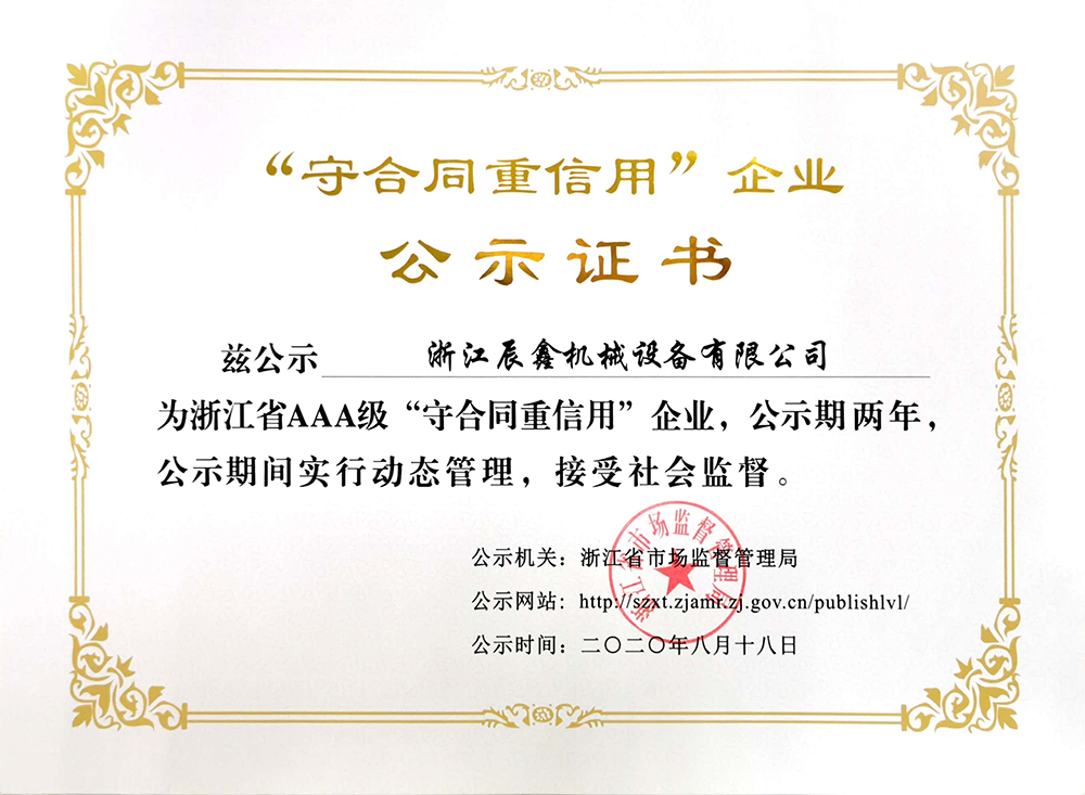 浙江辰鑫機械設備有限公司為浙江省AAA級“守合同重信用”企業,公示期為兩年,公示期間實行動態管理,接受社會監督。