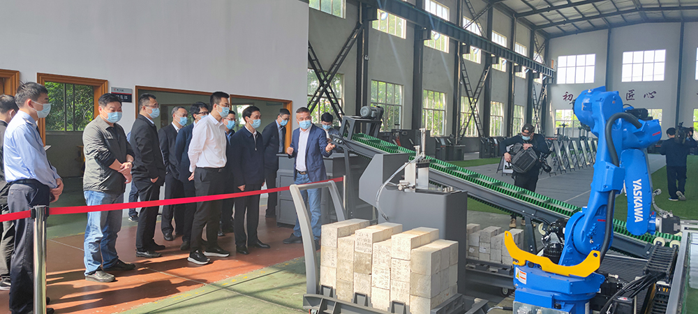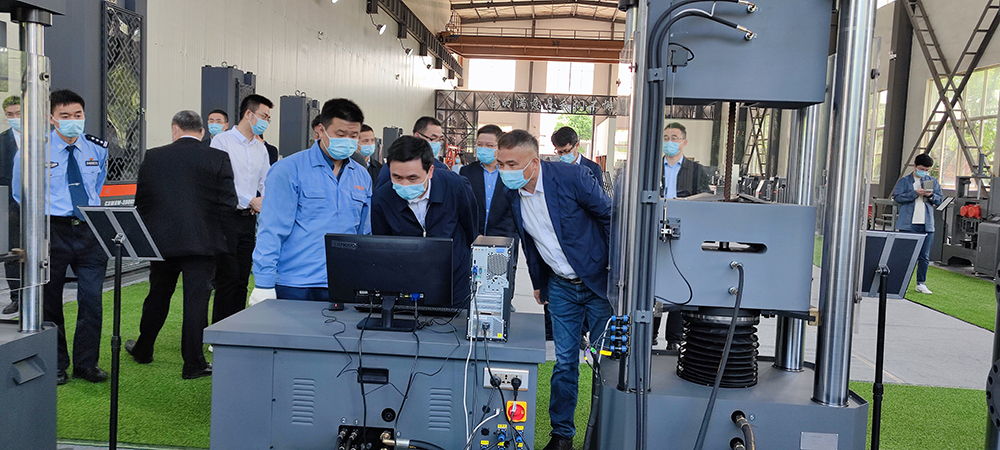 隨后,董事長阮偉鑫又向金區長一行介紹了我公司的錨固試驗機、萬能材料試驗機、壓力試驗機等多款產品,并演示、講解熱軋帶肋鋼筋拉伸試驗的原理及創新點。